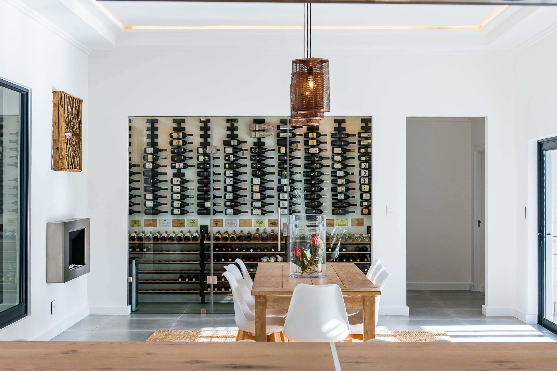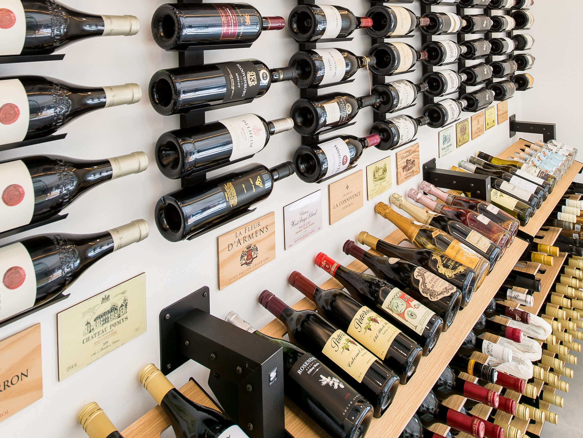 This cellar is a great example of a combination design. Matt Black spines and Wine Cradles above, featuring some favorite bottles, labels facing outwards. Then the Wine Ladder below with cork facing oak veneer shelves + 1 angle display top shelf.
